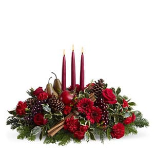 Hermoso y elegante candelabro en rosas, gerberas, follajes, canelas y otros. incluye 2 velones rojos