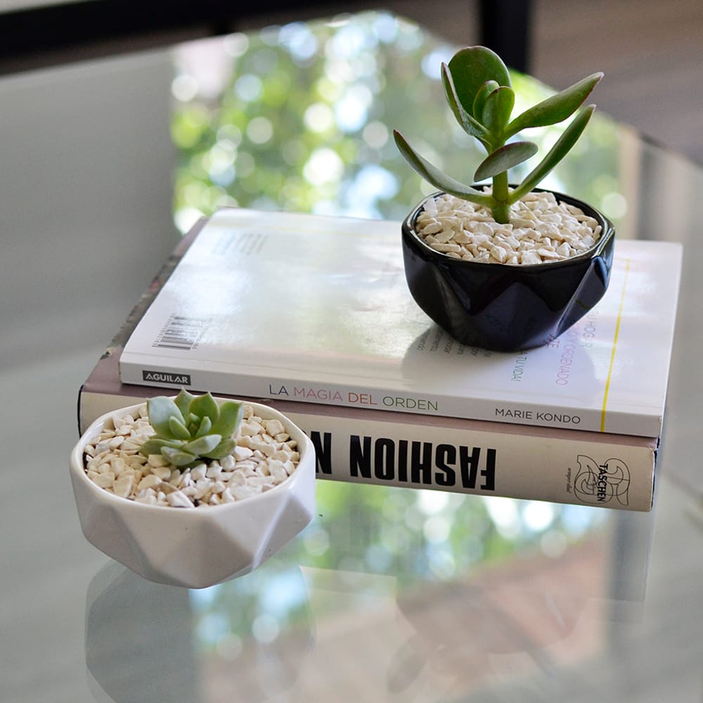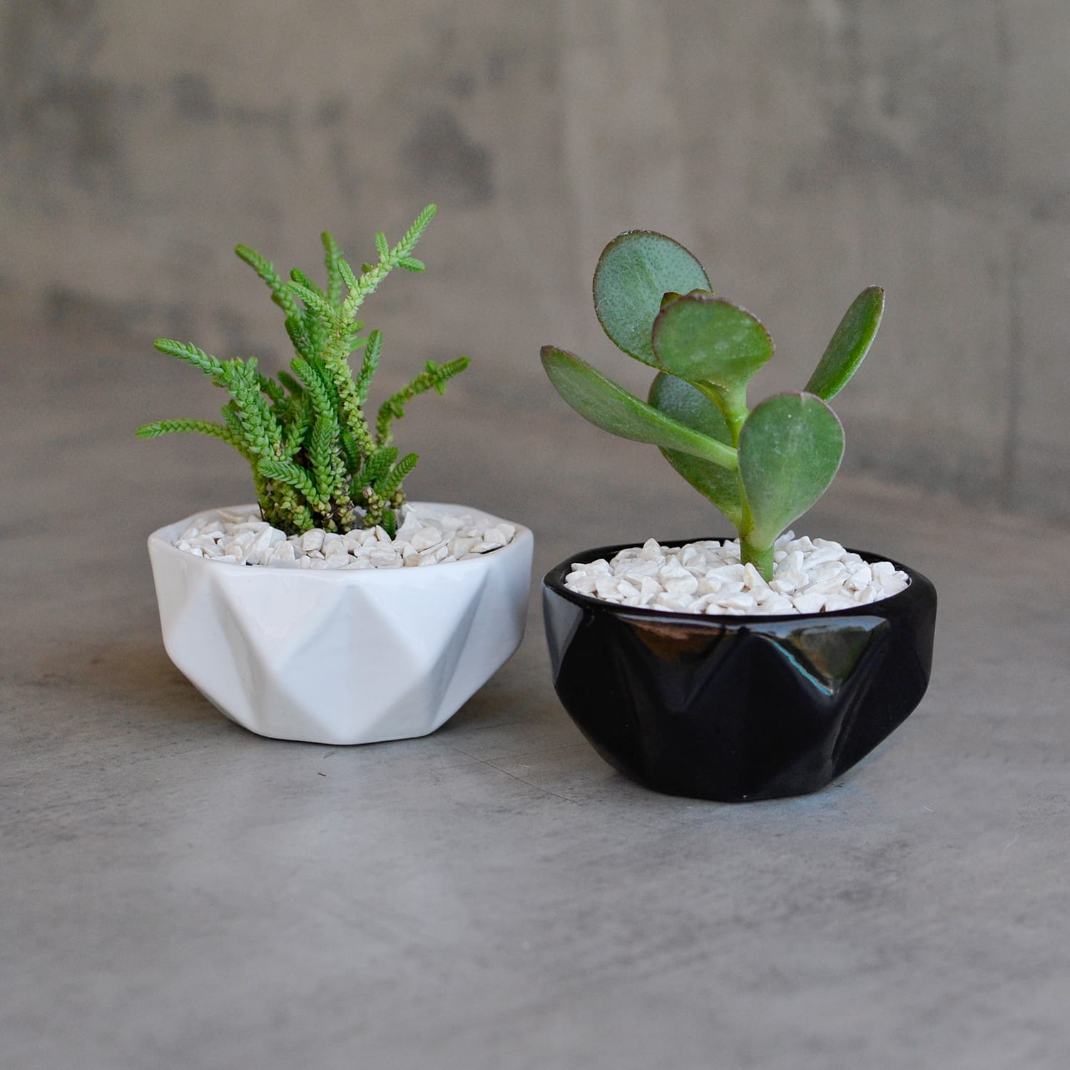 Pack de 2 maceteros de cerámica en color negro y blanco con suculentas. Las plantas de las imágenes son referenciales, las especies pueden variar según stock. Si necesitas una especie en especifico, escríbenos para confirmar stock.