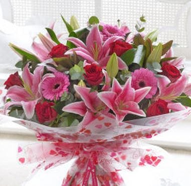Ramo de rosas, lilium y gerberas mas lindo follaje, 21 varas, envueltos en finos papeles y atado con cinta, en tonos rosados y rojos. Consultar por disponibilidad en otros colores.