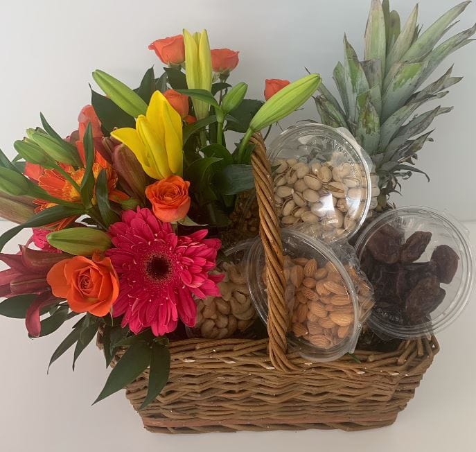 Un saludable arreglo floral de flores y frutos secos, un alimento necesario en la dieta diaria.