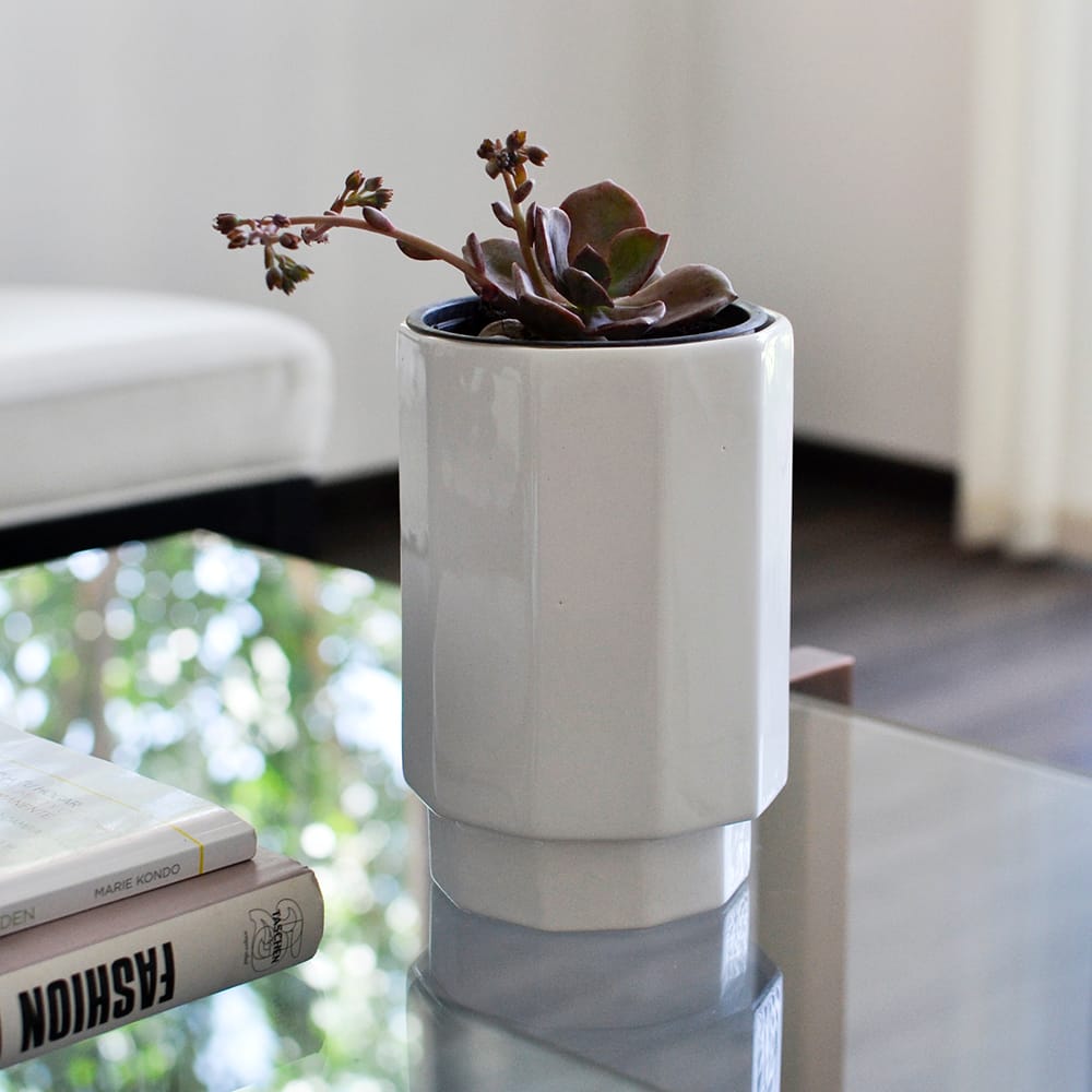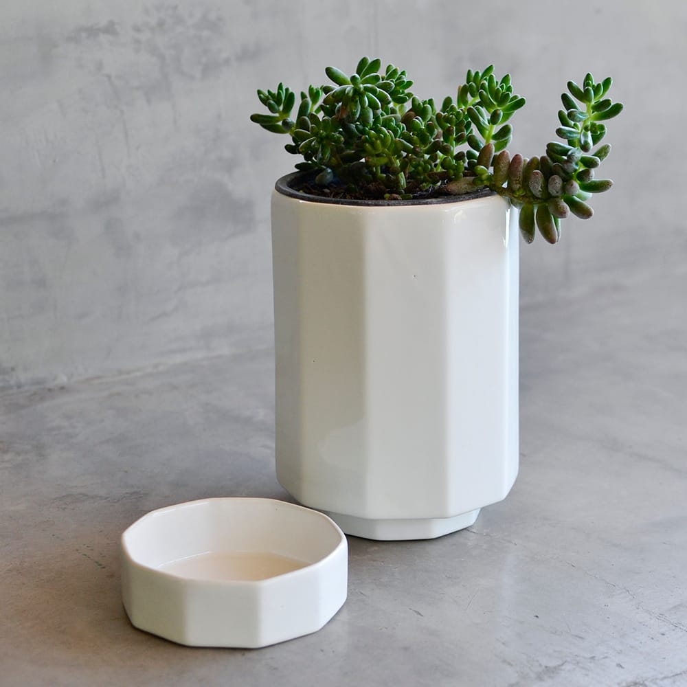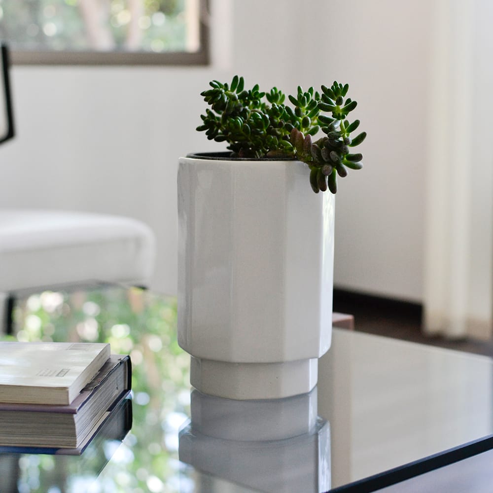Maceta de cerámica color blanco con suculenta. De líneas geométricas y simples, funciona para decorar cualquier espacio ! Incluye contenedor para el drenaje del agua