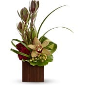 Leucadendro, orquídea y follaje. Un conjunto moderno en base de madera chocolate. Cotice por mas de 1 producto.