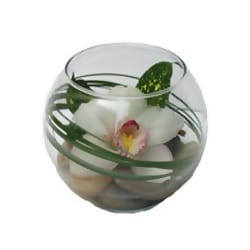 Hermosas Orquídeas cynbiduim en pecera de vidrio con piedras cuarzo.