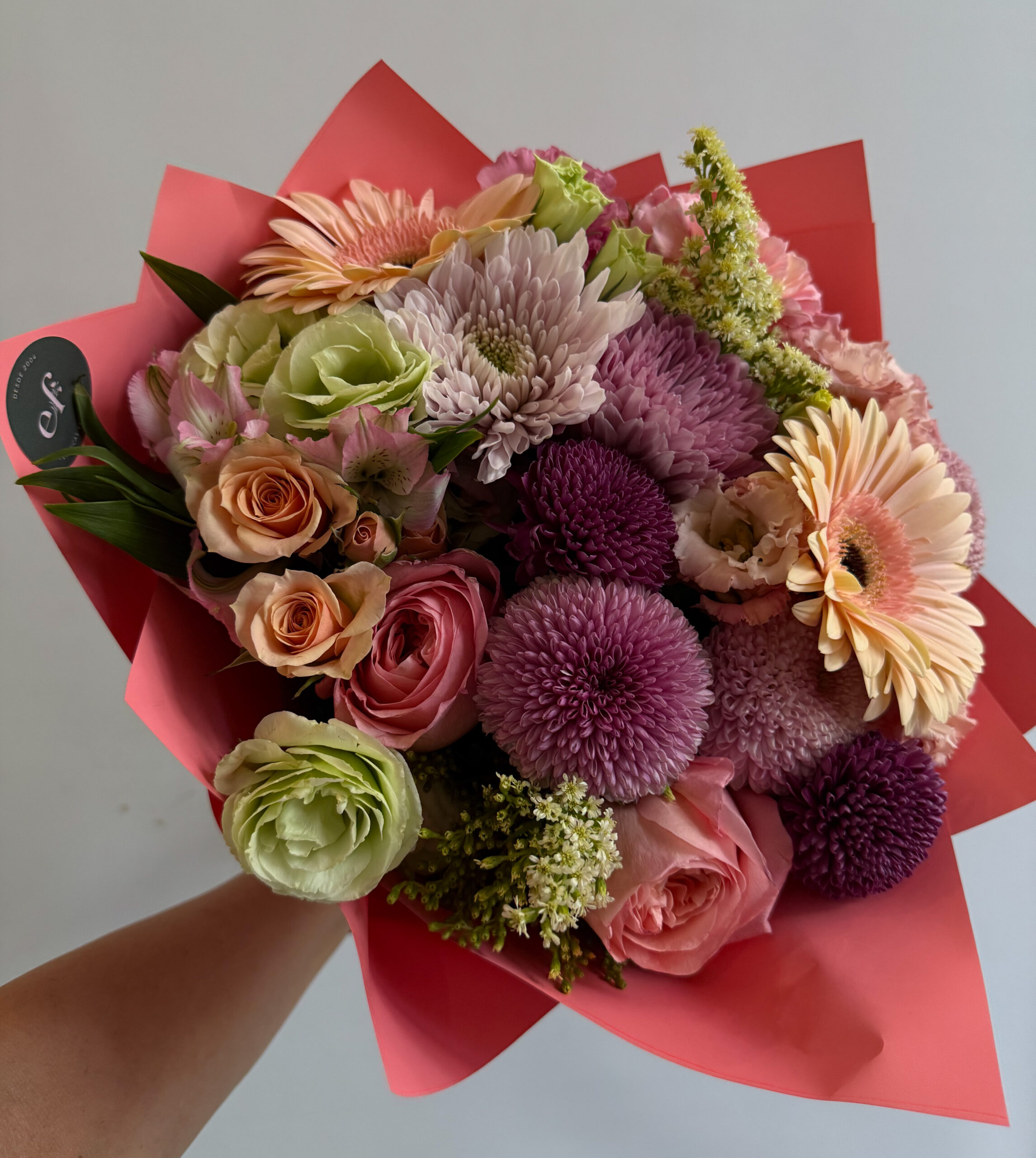 El Ramo de Flores para Regalar – Alegría Sofisticada es una celebración de colores, texturas y emociones, diseñado para sorprender y transmitir cariño en cualquier ocasión especial. Este ramo combina flores frescas en tonos rosados, lilas y verdes suaves, logrando un equilibrio perfecto entre elegancia, alegría y cercanía.
