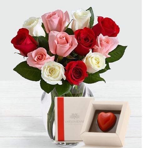 12 rosas premiun importadas en florero de vidrio mas Caja compuesta por 5 corazones cubiertos de chocolate Bitter 63% Cacao y relleno con la clásica receta de Caluga de leche Varsovienne. Leche, azúcar y delicados toques de mantequilla