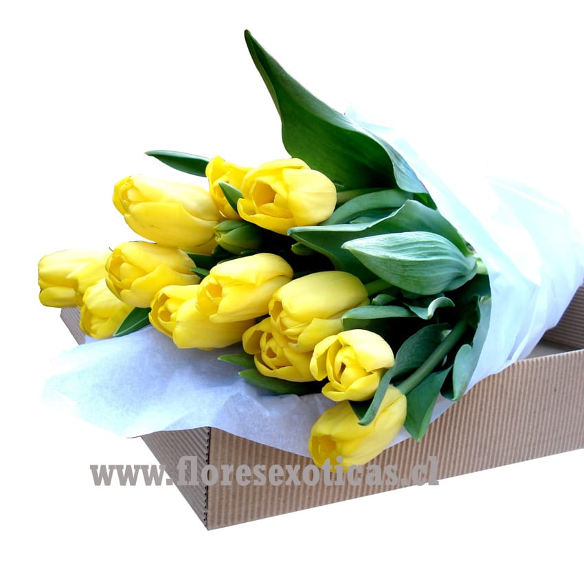 15 Tulipanes, en una finísima caja blanca, envueltas en papel de seda, atada con una hermosa cinta de organza. Cada uno de los tulipanes va con un hidratador para su mantención. Colores según disponibilidad.