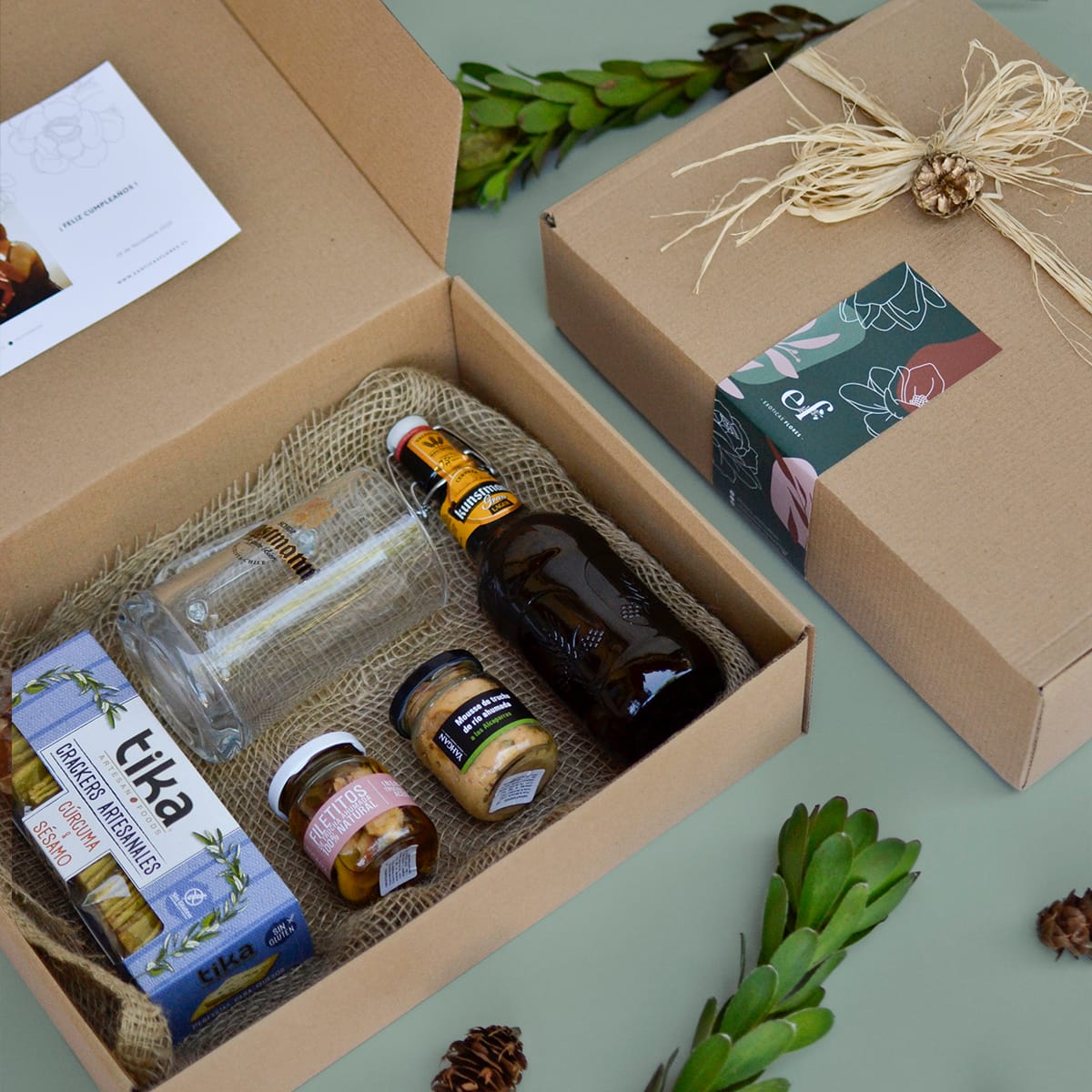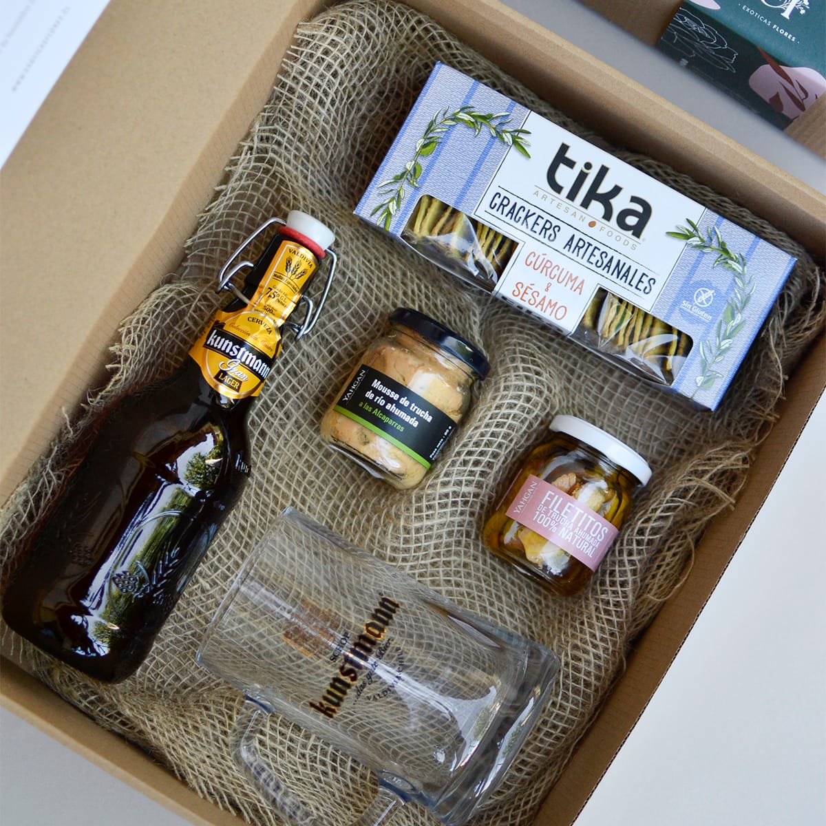 Filetitos de trucha ahunada, mousse de trucha de rio, todo en frascos de vidrio, mas 1 cerveza GRAN LAGER 500 cc,1 copa cervecera original Kunstmann y galleteas todo en una linda caja de regalo que puede reciclar.
